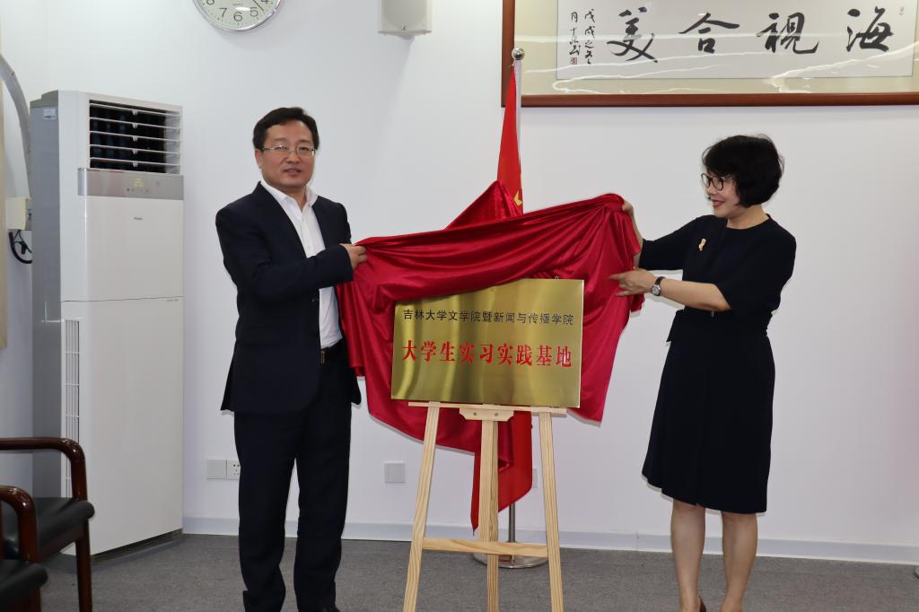 图2:心博官方网站_心博(中国)党委书记康永刚(左)、海南广播电视总台总编辑尹婕妤(右)共同为“大学生实习实践基地”揭牌。