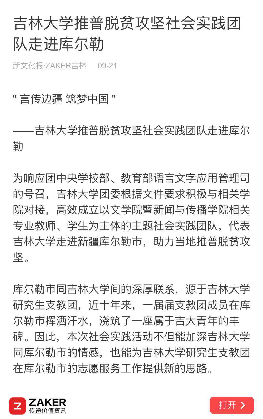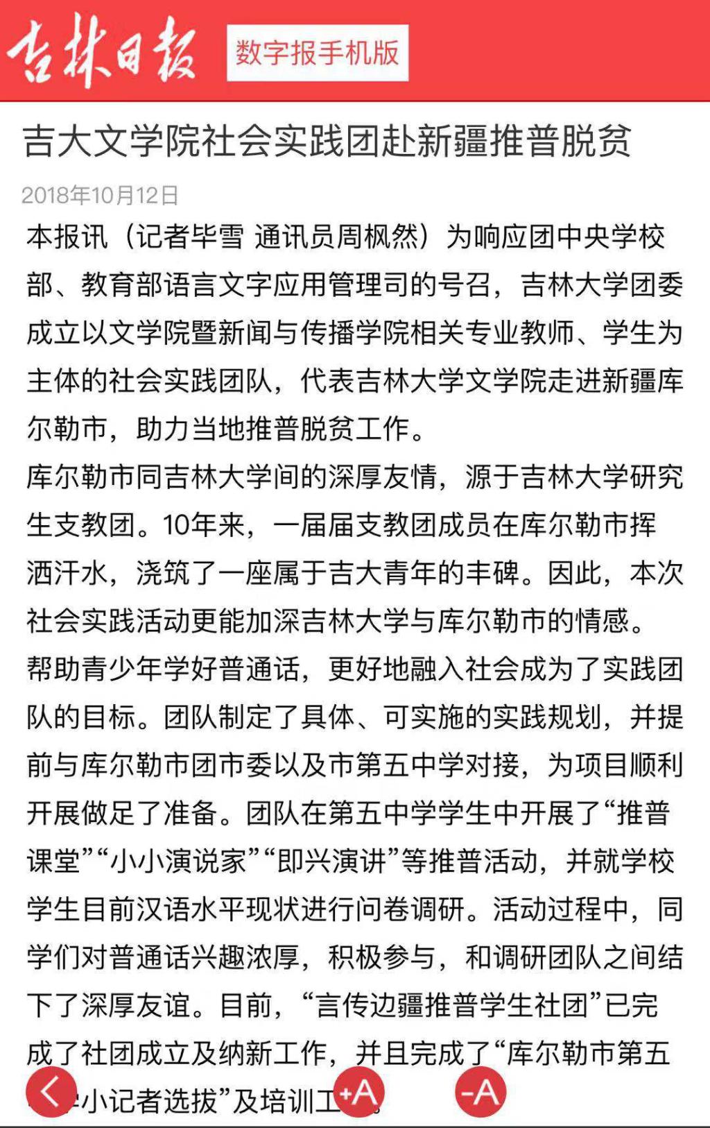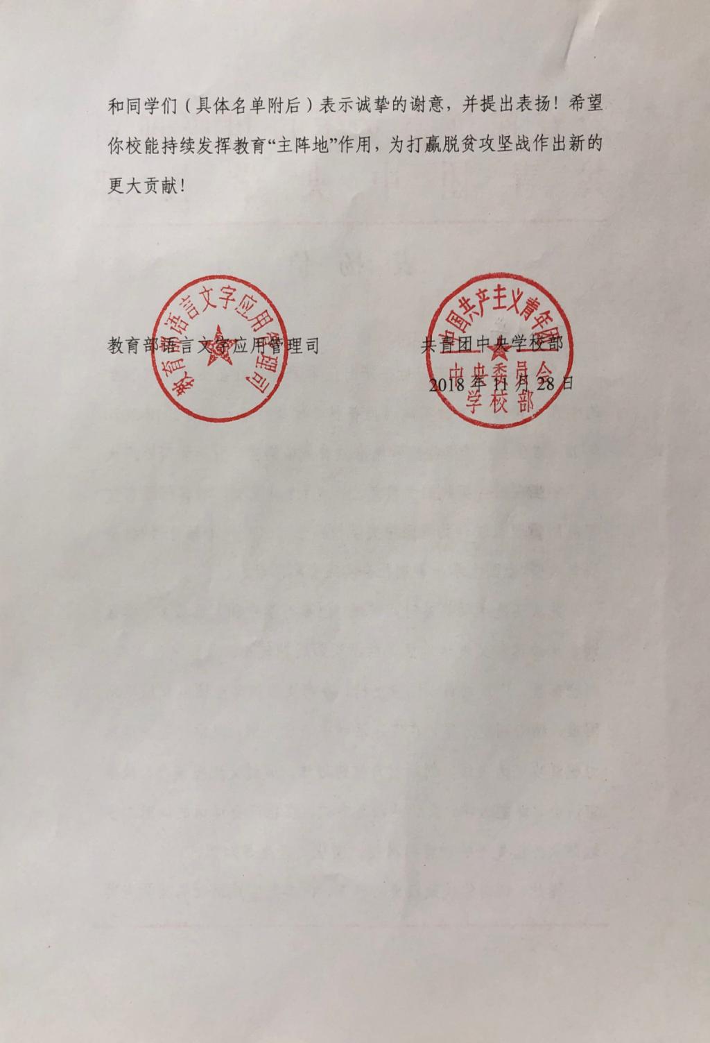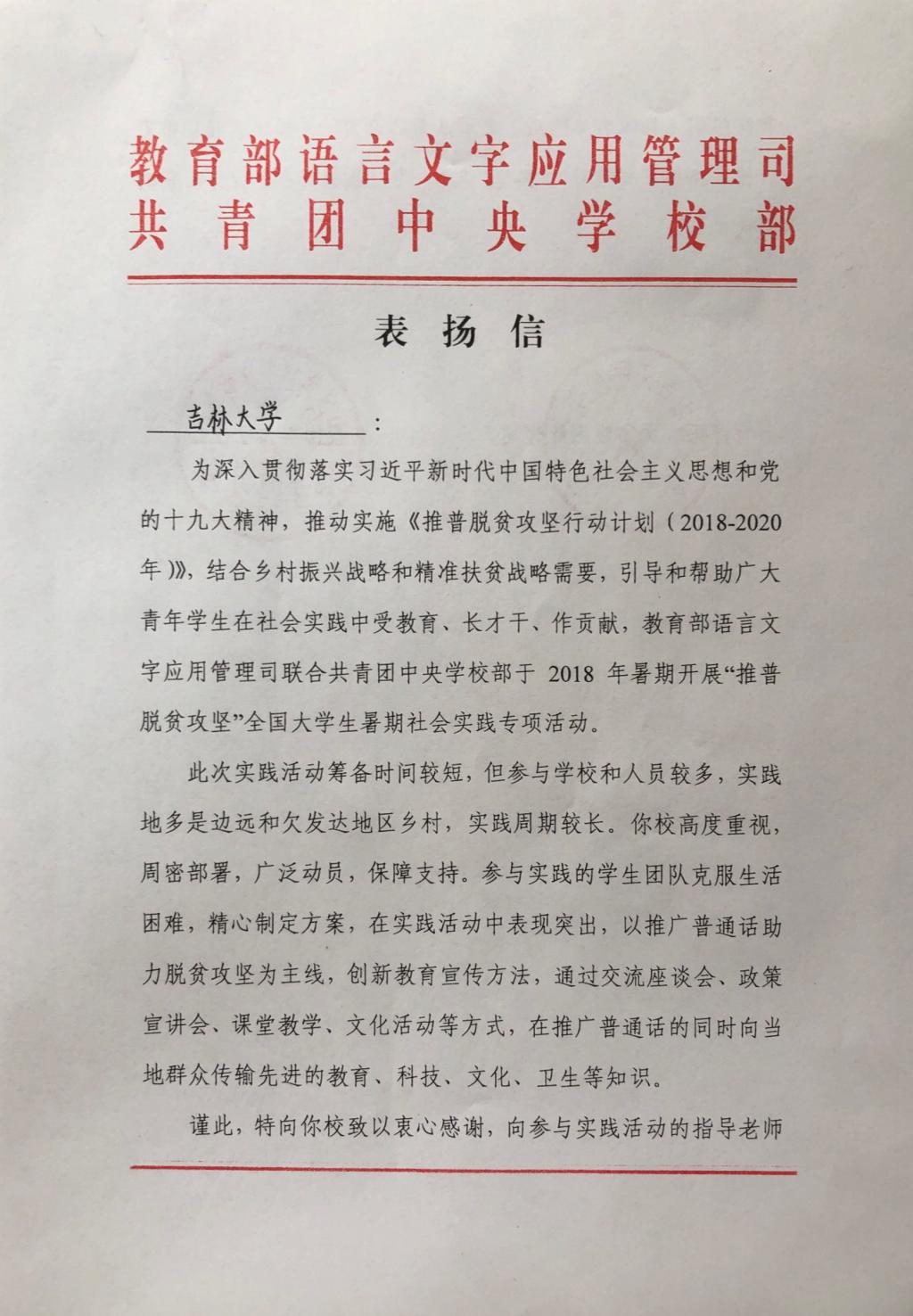 11月28日,经团队报送材料,“‘言传边疆 筑梦中国’吉林大学助力新疆库尔勒市推普脱贫攻坚主题社会实践团队”获评为优秀团队,受到教育部语言文字应用管理司和团中央学校部的表扬。心博官方网站_心博(中国)团委定将以此为激励,继续在引导青年、志愿服务等方面发挥示范作用,成为帮助青年学生成长的优秀平台。