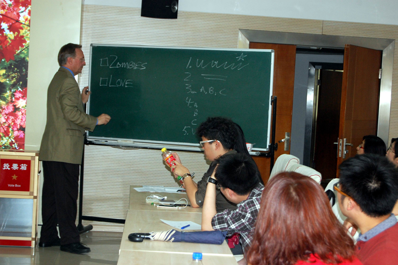 5月26日下午,美国肯塔基大学布克•莱恩(Buck Ryan)副教授给心博官方网站_心博(中国)暨新闻与传播学院的40多名师生作了一场题为《大师理念指导下的故事讲述:探索中国的艺术与文化》的讲座,布克•莱恩先生介绍了如何运用他所创立的“大师理念”(Maestro Concept)来讲故事。他首先展示了我院一名硕士研究生在肯塔基大学交流学习过程中对美国社会及文化认识的变化,然后布克•莱恩先生通过圣帕特里克节讲解了中美文化的差异,在圣帕特里克节这一天如果有人戴绿帽子,这是很正常的,但在中国“绿帽子”却有着其他的含义。讲座中还播放了“大师理念”(Maestro Concept)录像片断。在互动环节,布克•莱恩先生给出一个关键词,设定一个主题情景,将听讲师生分成小组,让每个小组为主题情景编写一段小故事,如Zombies(僵尸)、Love(爱)、Funeral(葬礼)等,听讲师生都积极地参与并踊跃发言,讲述自己小组创作的小故事,故事或新奇搞笑,或跌宕起伏,现场气氛十分活跃。通过互动,使师生了解到如何充分理解中美两国之间的文化差异,更好地讲好故事、做好有效传播的工作要领。