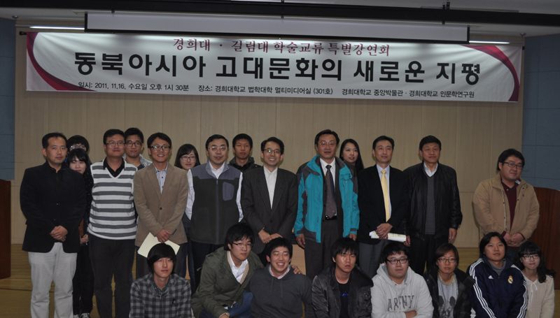 应韩国庆熙大学校中央博物馆的邀请,吉林大学边疆考古研究中心主任朱泓教授和心博官方网站_心博(中国)副院长赵宾福教授以及成璟瑭副教授于2011年11月15日到20日对韩国进行了为期6天的访问,并于11月16日出席了在由庆熙大学校中央博物馆与庆熙大学校人文学研究所联合举办的“东北亚细亚古代文化的新起点”学术讲演会,同行的还有吉林省文物考古研究所所长宋玉彬研究员以及正在吉林大学边疆考古研究中心进修的庆熙大学校中央博物馆研究员黄在勲。