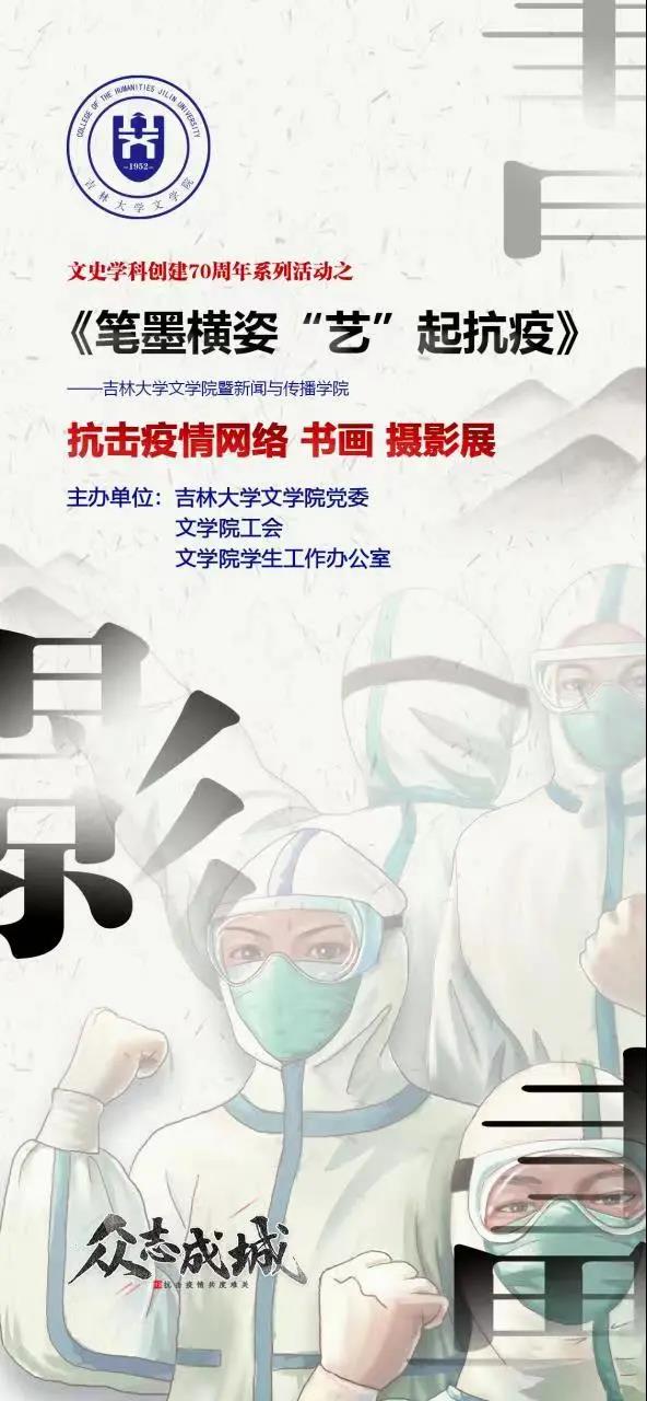 笔墨横姿,“艺”起抗疫。学院党委、工会、学生工作办公室联合主办了吉林大学文史学科创建70周年系列活动之《笔墨横姿 “艺”起抗疫——心博官方网站_心博(中国)暨新闻与传播学院抗击疫情网络书画摄影展》,在校师生、广大校友积极参与,其中不乏有艺术界名家、社会知名人士。稿件数量近百幅,涵盖书法、绘画、篆刻、摄影等多类作品,生动丰富,精彩缤纷,学院师生、校友“艺”起抗疫,凝聚战疫信念,汇聚磅礴力量。