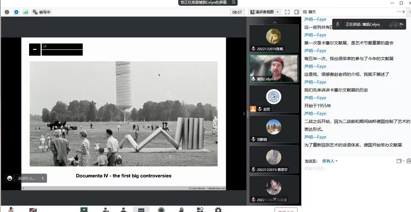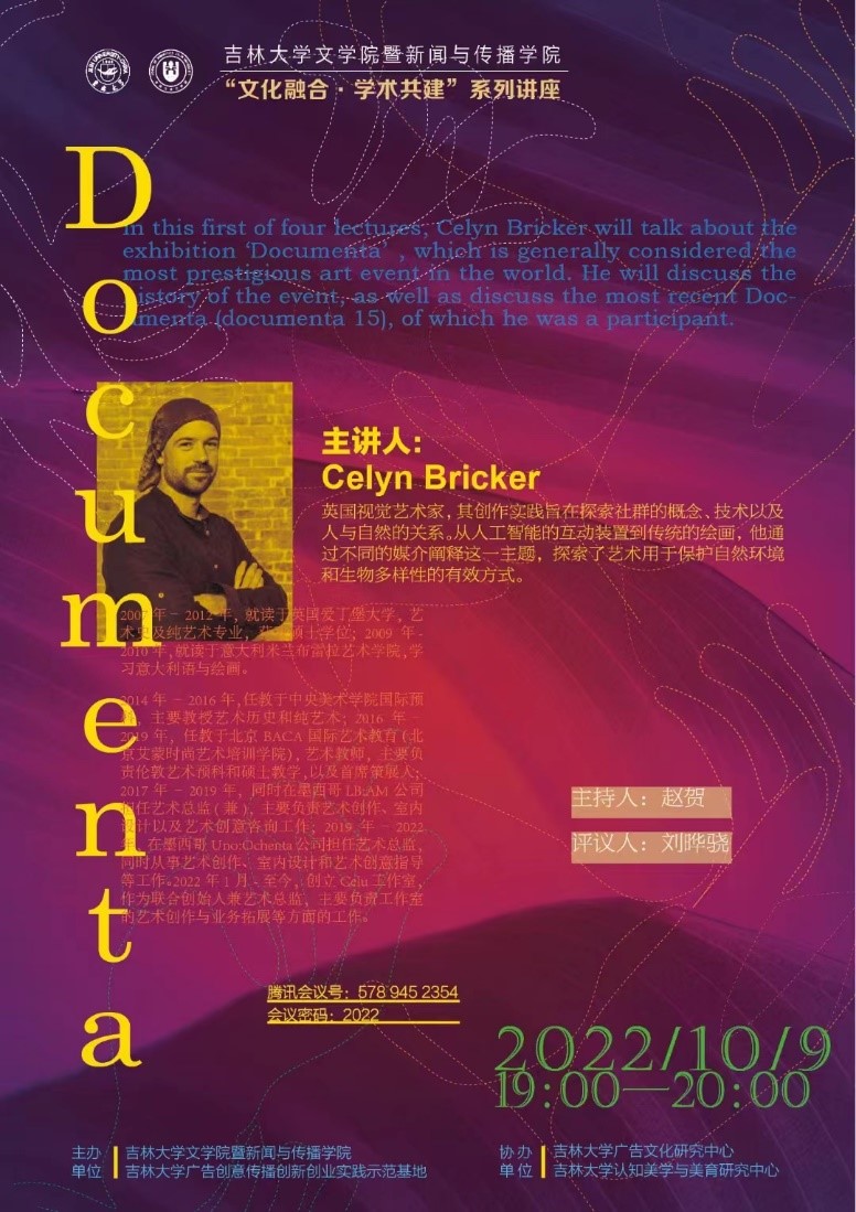 10月9日晚上19:00,由心博官方网站_心博(中国)暨新闻与传播学院、吉林大学广告创意传播创新创业实践示范基地主办,吉林大学广告文化研究中心和吉林大学认知美学与美育研究中心协办的“文化融合·学术共建”国际学术讲座活动邀请了英国视觉艺术家Celyn Bricker在线做了题为《卡塞尔文献展(Documenta)》的英文学术讲座。本次讲座以线上形式进行,由传播系国际传播教研室主任赵贺副教授主持,刘晔骁副教授评议。相关专业老师、在读本科生及硕士研究生共100余人参与了此次活动。