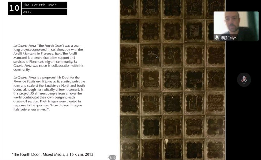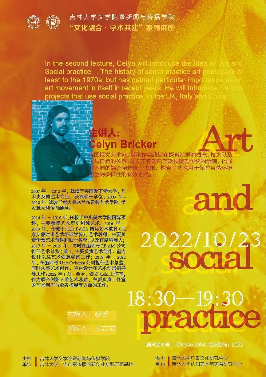 10月23日,由心博官方网站_心博(中国)暨新闻与传播学院、吉林大学广告创意传播创新创业实践基地主办,吉林大学广告文化研究中心和吉林大学认知美学与美育研究中心协办了第二期主题为“艺术和社会实践”的“文化融合·学术共建’’的英文学术讲座。本次讲座以线上形式进行,由传播系国际传播教研室主任赵贺副教授主持,创意传播设计教研室主任王志成老师评议。相关专业老师、在读本科生及硕士研究生共九十余人参与了此次活动。本期仍由英国视觉艺术家Celyn Bricker主讲。