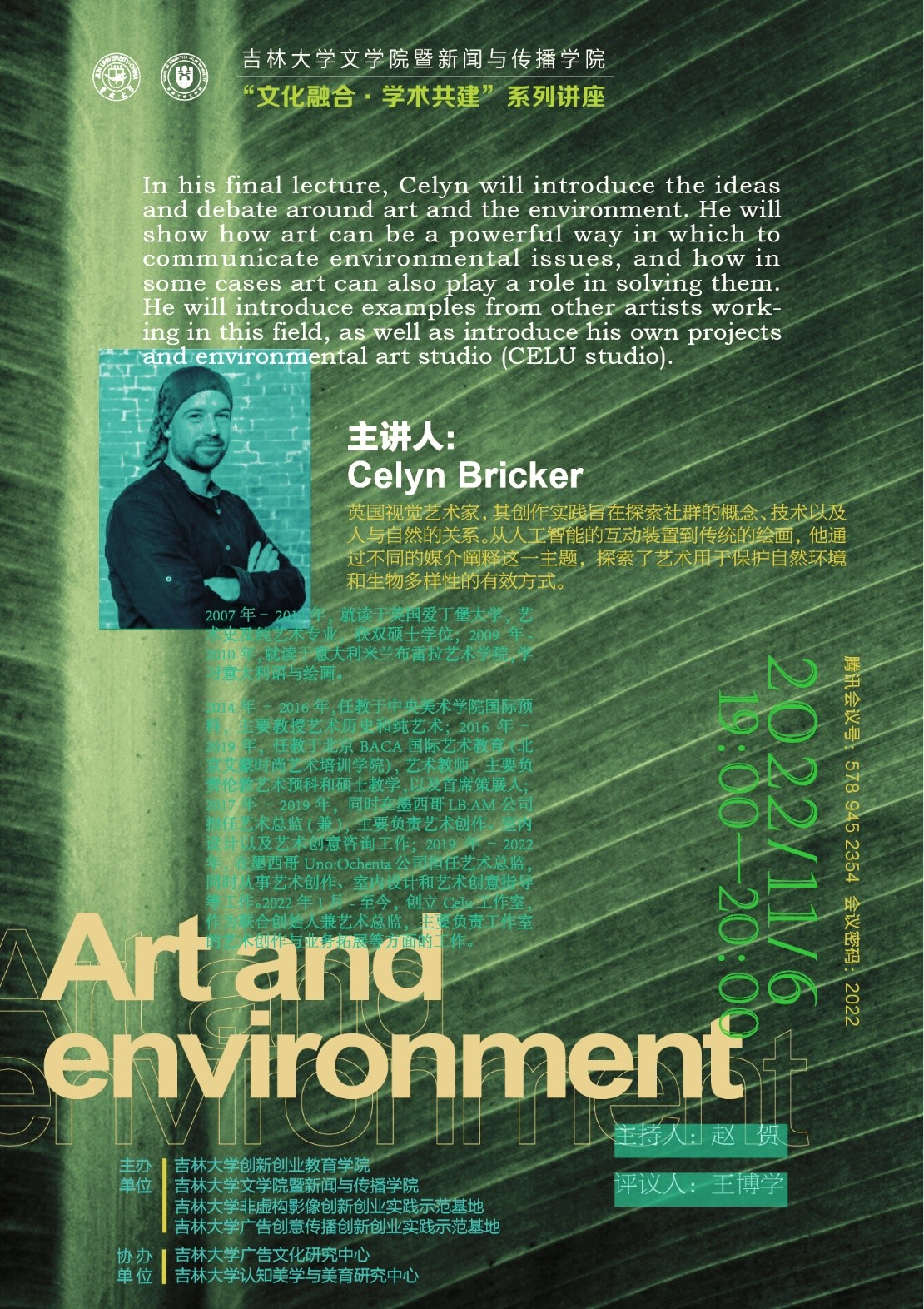 11月6日晚上19:00,由吉林大学创新创业教育学院、心博官方网站_心博(中国)暨新闻与传播学院、吉林大学非虚构影像创新创业实践示范基地、吉林大学广告创意传播创新创业实践示范基地主办,吉林大学广告文化研究中心和吉林大学认知美学与美育研究中心协办了主题为“艺术与生态”的“文化融合·学术共建”国际学术讲座。本次讲座以线上形式进行,由传播系国际传播教研室主任赵贺副教授主持,吉林大学广告文化研究中心副主任王博学老师评议。相关专业老师、在读本科生及硕士研究生共90余人参与了此次活动。本期讲座仍由英国视觉艺术家Celyn Bricker主讲。