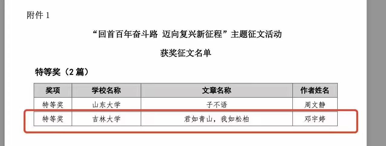 邓宇婷在《君如青山,我如松柏》中用生动的故事、动人的文笔,传达了抗疫精神、家国情怀、红色历史、吉林故事,展现出对祖国的热爱以及对台湾回归的迫切希望。她表示,自己定会为中华民族伟大复兴的中国梦做出贡献。