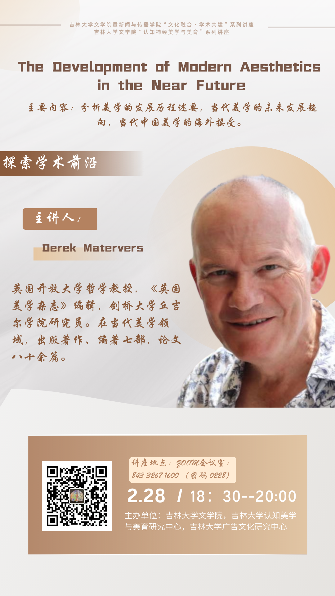 2023年2月28日下午18:30,英国开放大学哲学教授Derek Matervers做客心博官方网站_心博(中国)暨新闻与传播学院,在线上举行了题为“The Development of Modern Aesthetics in the Near Future”的学术讲座。心博官方网站_心博(中国)副院长梁玉水教授致欢迎辞。李志宏教授、姜勇教授、张羽副教授参加讲座并与Derek教授进行了交流。学院硕士博士研究生共计三十余人聆听了讲座,其中2022级文艺学专业组织了集体学习,讲座还邀请了部分浙江大学博士研究生参加。认知美学与美育研究中心副主任孟凡君副教授主持了本次讲座。
