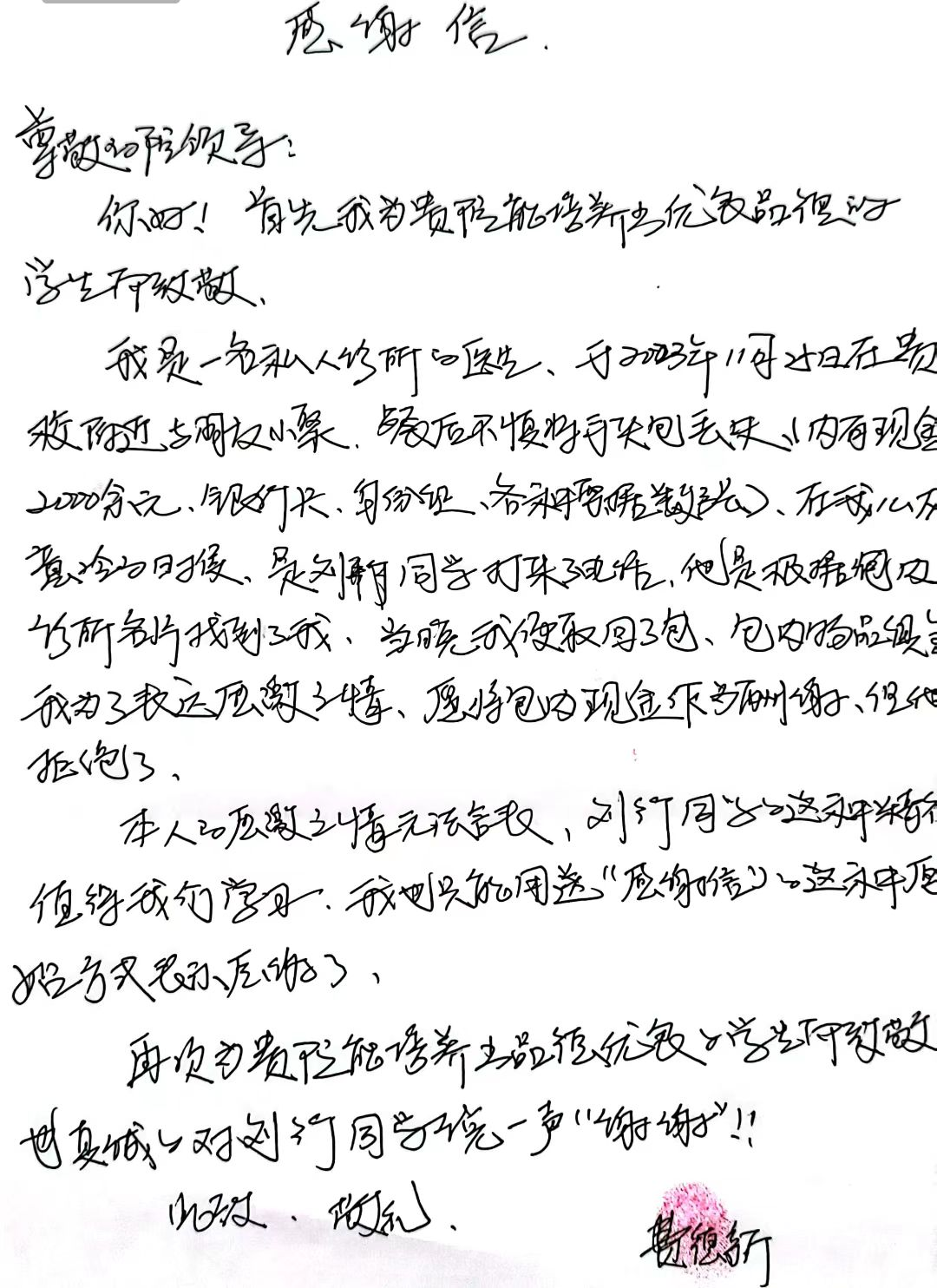 11月28日上午,失主费医生出现在心博官方网站_心博(中国)暨新闻与传播学院学生工作办公室门口,他手中拿着一面锦旗、一封感谢信,来院对学生本人及学院的培养表达感谢。辅导员杨佳欣老师立即停下手中的工作前来接待。在交谈中了解到,失主费医生于11月25日和朋友在我校附近小聚,畅谈到下午四点多。由于晚高峰打车困难,费医生步行了一段路才乘出租车回到诊所。到诊所后才发现自己的钱包不见了。不记得车牌号的失主费先生惊慌失措,正值心灰意冷的时刻,我院学生刘邢给费医生打电话,说明自己捡到了他的钱包,并与失主沟通好时间地点交还钱包,欣喜不已的费医生当晚便取回了钱包,包内物品齐全。心中无比激动的费医生当场便想要给刘邢同学现金表示感谢,刘邢同学婉拒了。在费医生再三询问下,刘邢才说出自己的姓名和所在学院。刘邢同学在捡到钱包后,没有丝毫犹豫,考虑到失主焦急的心情,争分夺秒联系失主归还财物。她的品行不仅给身边的同学们树立了一个好榜样,也让学院的老师和同学们倍感骄傲。