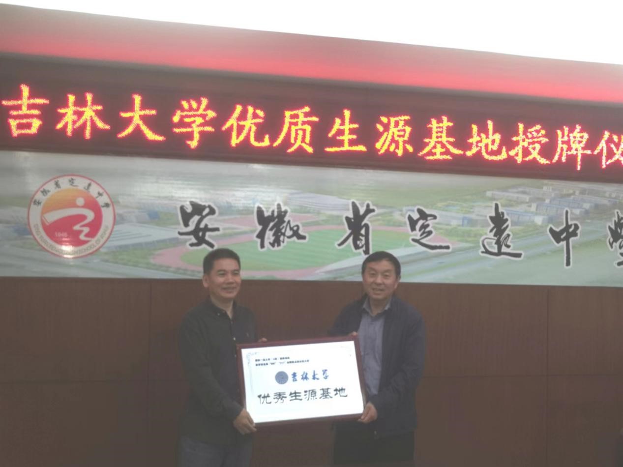 座谈后李静代表吉林大学向定远中学授予了优秀生源基地牌匾。