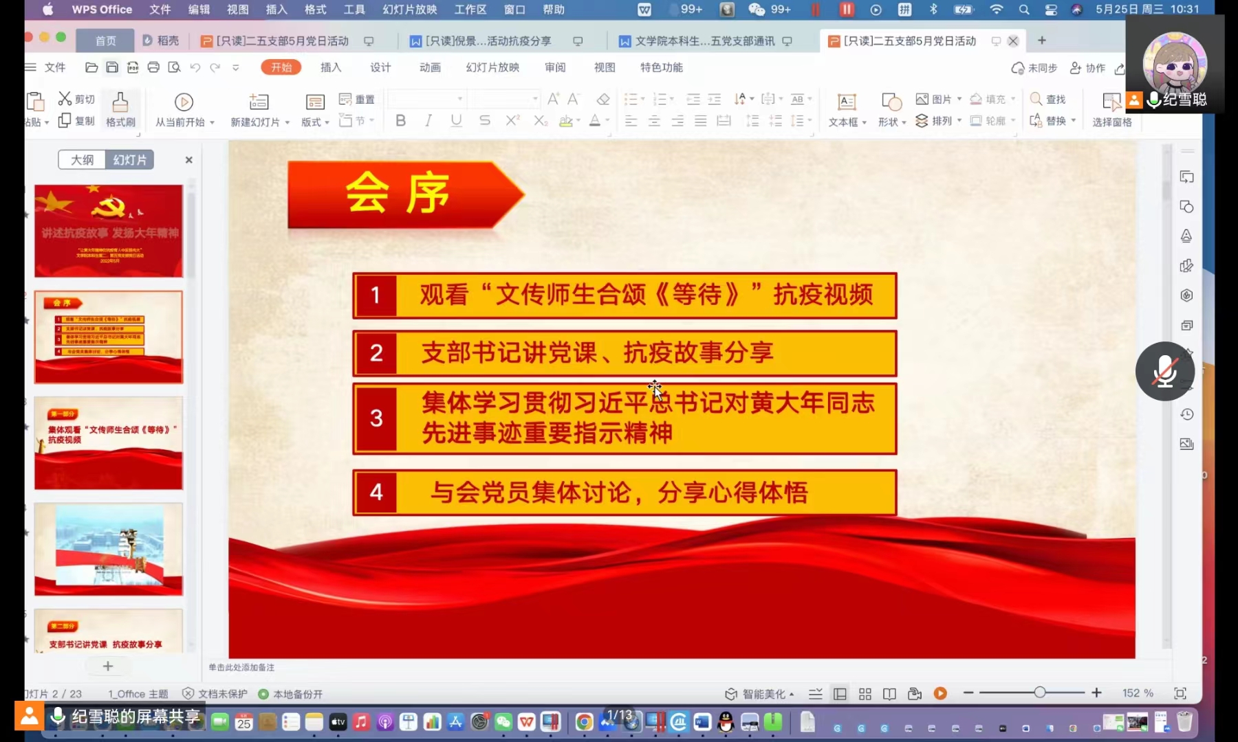 在过去的两年里,中国共产党团结带领全国各族人民,进行了一场惊心动魄的抗疫大战,经受了一场艰苦卓绝的历史大考,取得了抗击新冠肺炎疫情斗争的重大战略成果,创造了人类同疾病斗争史上的又一个英勇壮举。正是在这场殊死较量中,中国人民和中华民族谱写了一段可歌可泣的抗疫史诗,铸就了“生命至上、举国同心、舍生忘死、尊重科学、命运与共”的伟大抗疫精神。对此,按照学校要求,心博官方网站_心博(中国)本科生第二、第五党支部于2022年5月25日上午10:30在腾讯会议开展“讲述抗疫故事,发扬大年精神”主题党日活动。会议由第二党支部书记曲昭琦和第五党支部书记王振彰组织召开,支部全体党员、2022年第一期新闻与传播学院发展对象参加会议。