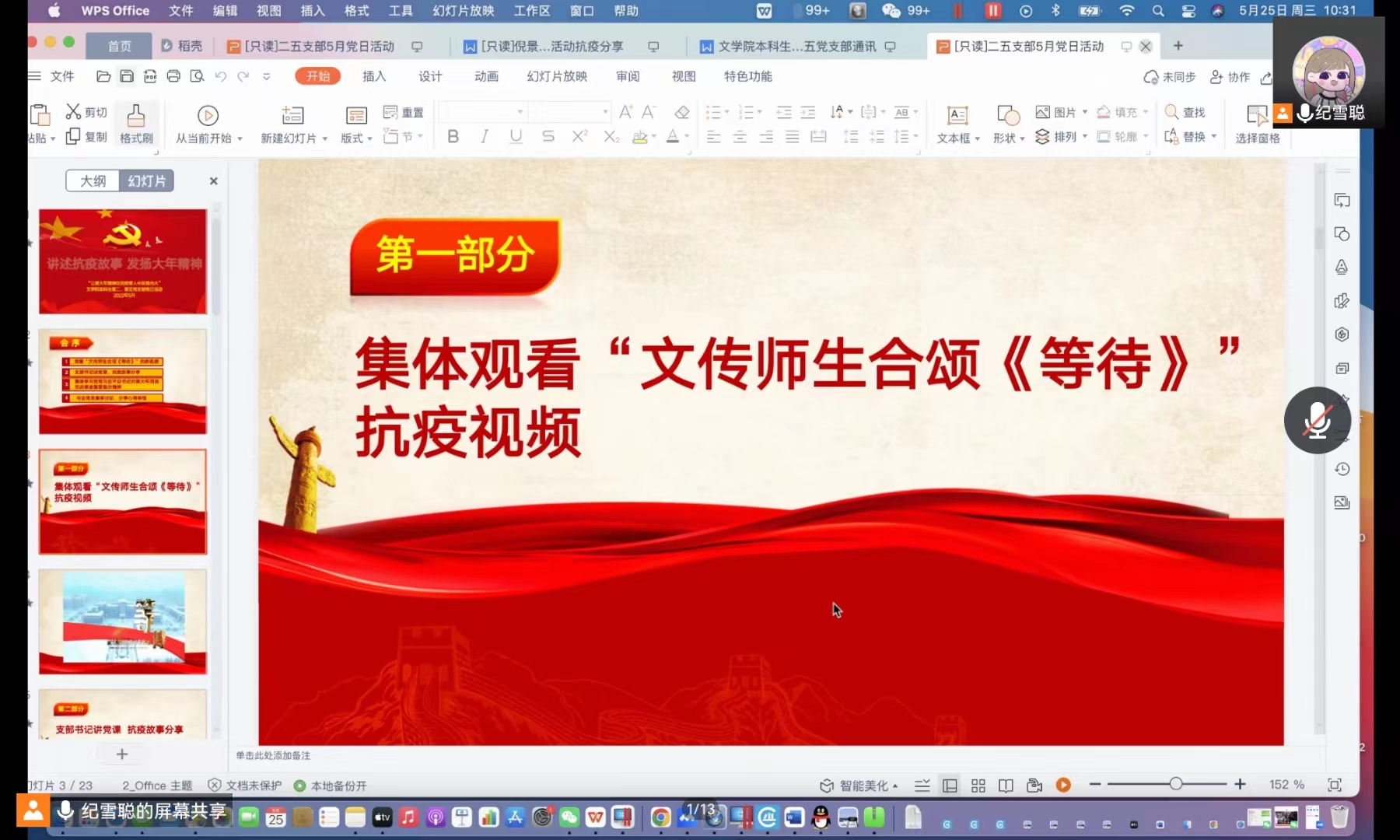 活动第一项,与会党员共同观看“文传师生合颂《等待》”抗疫视频。当下,疫情形势虽有明朗,但防疫意识不能放松。在疫情期间,本学院凭借专业特色优势,学院师生共同策划完成了《等待》《一起向未来》等系列视频、朗诵、歌曲类文艺作品,《等待》由作者亚东创作,由刘迎新老师、许婧文、张儒硕、孙童楷、于佳希共同朗诵,引发良好反响,在师生汇聚起点点萤火,引燃希望的火把,让我们看到相信胜利的曙光就在眼前,也感受着同学们在老师们的带领下,在疫情防控这场大战大考中不断贡献着磅礴的青年力量。