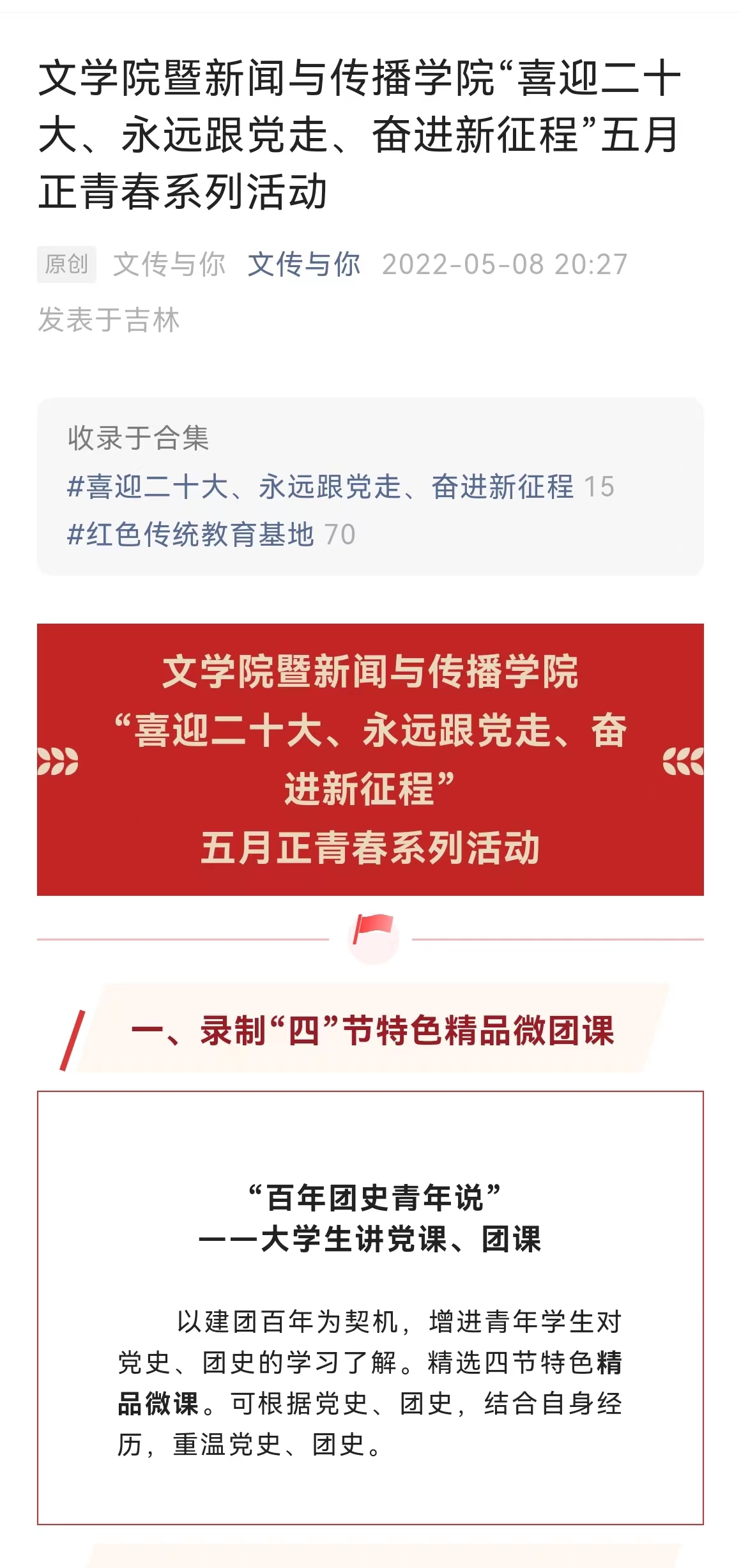 为庆祝中国共青团成立一百周年,贯彻落实党中央关于党团史学习教育的决策部署,心博官方网站_心博(中国)暨新闻与传播学院开展“喜迎十二大,永远跟党走,奋进正青春”五月正青春,五个“四”系列活动,活动得到学院师生的积极响应。