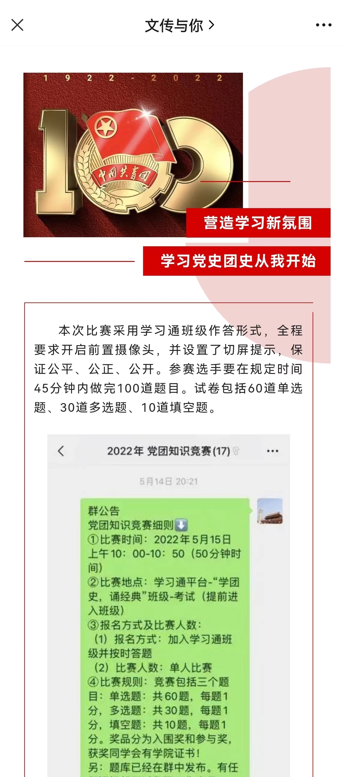 “四”类比赛均圆满收官。2022年5月15日上午10时,团学组织生活保障部举行了“学党史,诵经典”团史知识竞赛活动,各位选手比赛前根据所给材料充分准备,比赛时认真作答,最终共14名同学获得荣誉;在“我的青春我的团”征文比赛中,同学们积极投稿,书写与吉大共青团的故事,讲述自己与吉大共青团的青春回忆,表达爱国热情和爱团热忱,经评比,最终苏安洋同学的作品《我是青春我是团——我的青春我的团征文活动》获得特等奖、刘晓莉同学的作品《叶子——致吉大共青团》获得优秀作品奖、帅子星同学的作品《初春朝日 利刃发硎——我的党团故事》获得优秀奖;在“百年薪火,砥砺共进”摄影比赛中,同学们围绕党员故事主题和家乡变化主题创作出了一批优秀的作品,展现出抗击新冠疫情过程中冲锋在前线的优秀党员、团员代表模范形象和新时代家乡日新月异的发展变化,呼吁我们砥砺共进,走向新征程;在“五四精神,传承有我”视频大赛中,同学们通过视频制作形式展示建设祖国的伟大成就和广大青年不畏艰险、积极向上的精神风貌。