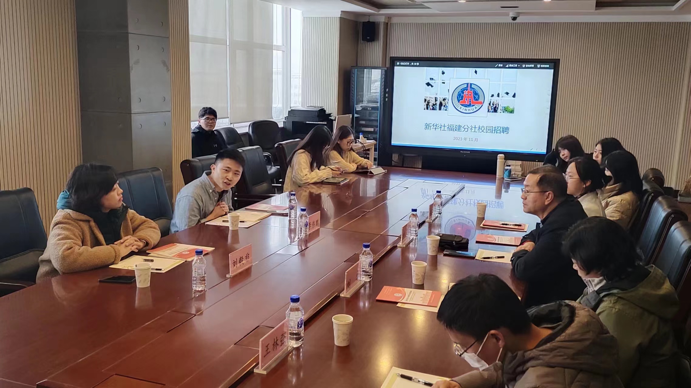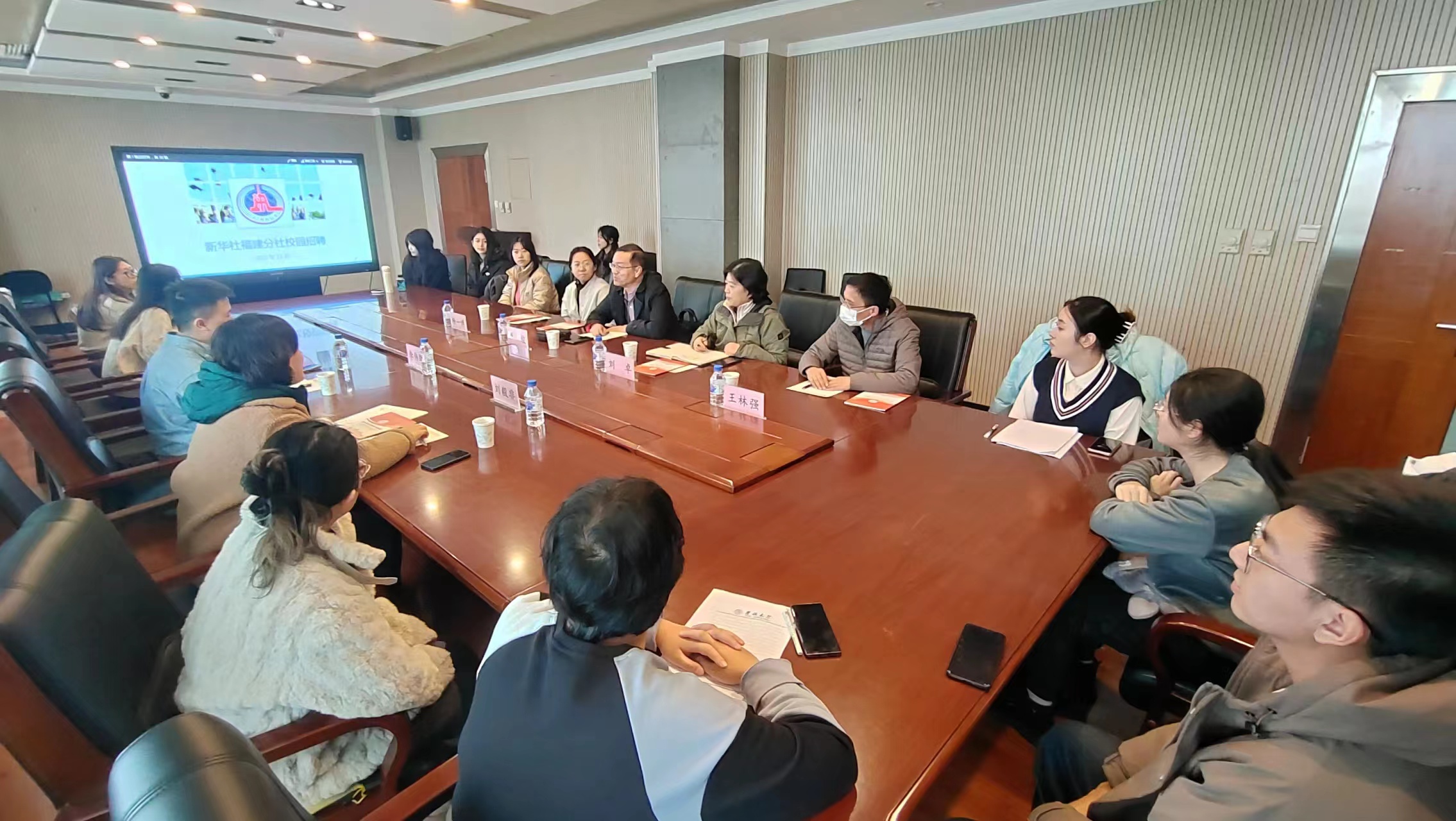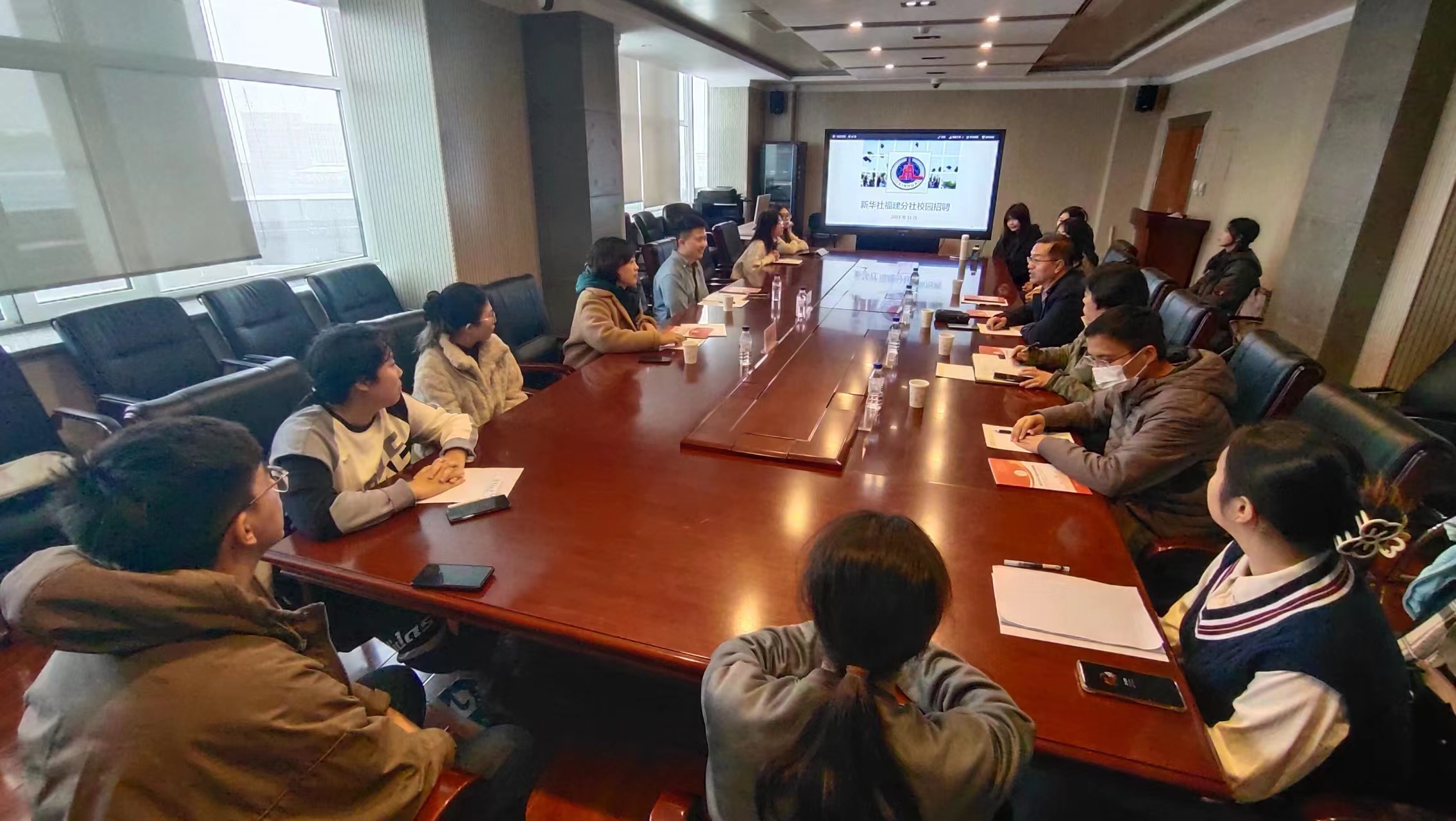 11月6日下午,心博官方网站_心博(中国)暨新闻与传播学院与新华通讯社福建分社举办就业座谈会,心博官方网站_心博(中国)党委副书记兼纪委书记刘卓、心博官方网站_心博(中国)党委副书记兼副院长杨一博、心博官方网站_心博(中国)新闻学系主任严俊教授、新华社吉林分社办公室副主任刘毅非、新华社中经社福建分公司部门主任李伟鹏出席本次就业座谈会,本科、研究生毕业年级辅导员及学生代表参加会议。