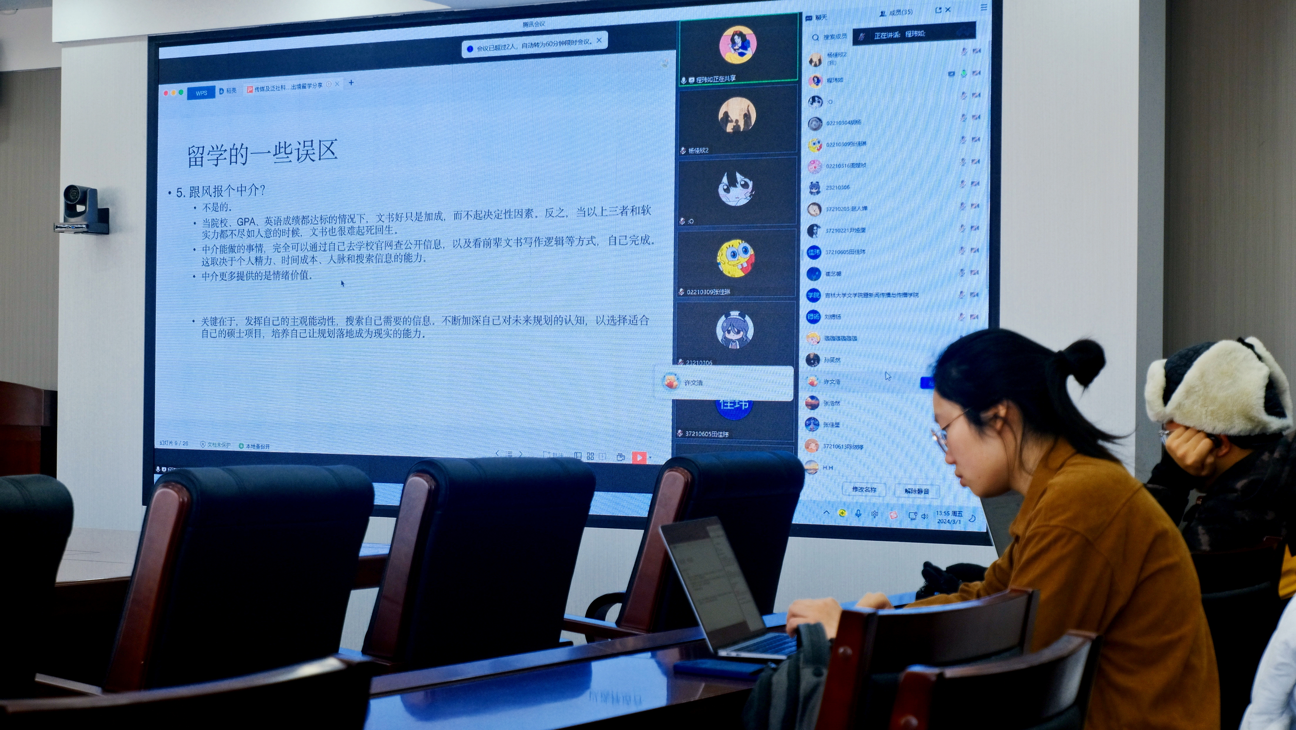 杨佳欣对校友程玮如返校宣讲表示了热烈欢迎和衷心感谢,并向同学们介绍了她的学业经历。据悉,程玮如曾作为交换生在日本早稻田大学亚太研究科学习,曾于ICA、IAMCR以及中国新闻史学会年会上发表多篇一作论文。会上,程玮如依托其在学业实践领域的丰富经验,以独特的视角和深入的见解,为在场的同学提供了一场关于传媒及泛社科专业留学的全面分享,同学们收获了宝贵的学术经验及学业发展路径参考。程玮如针对香港、新加坡、英国、日本等地区的传媒及泛社科专业留学申请流程进行了深入解析,厘清了一些基本概念,提供了实用的申请策略。包括如何选择合适的学校和专业、如何准备申请材料,以及进行有效面试的方法策略。她的分享除基于个人的实践经验外,还结合了对当前留学趋势、政策的深刻理解把握。会议尾声,程玮如与在场学生进行了互动答疑。同学们踊跃提出了关于境外留学前期准备、申请过程中的常见问题以及留学生活的众多细节,程玮如耐心地回答了每一个问题,提供了详尽的建议。