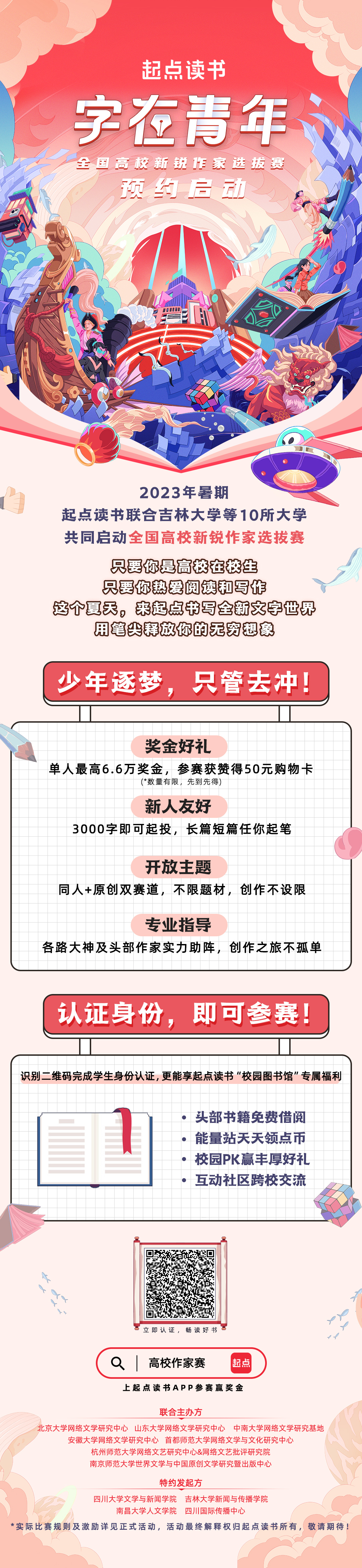 高校学子登陆起点读书app,搜索“高校作家赛”即可参赛。详细比赛规则后续将在起点读书、四川国际传播中心网站center.top、推特账号@Center.Sichuan、脸书账号@Center.Culture、微信公众号“四川国际传播中心”等平台发布。